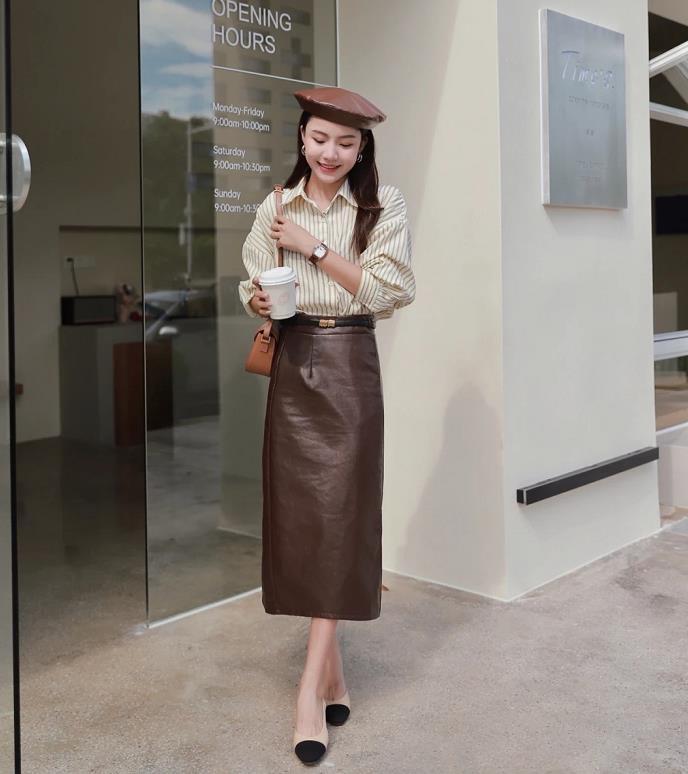 试问,谁能拒绝一条棕色系的皮裙呢?这种自带复古气息的颜色,说适合,很适合秋冬,但Lily觉得春天穿也不差。对于小个子女生来说,这种膝盖以上长度的裙子最合适了,也能打造出高挑感。