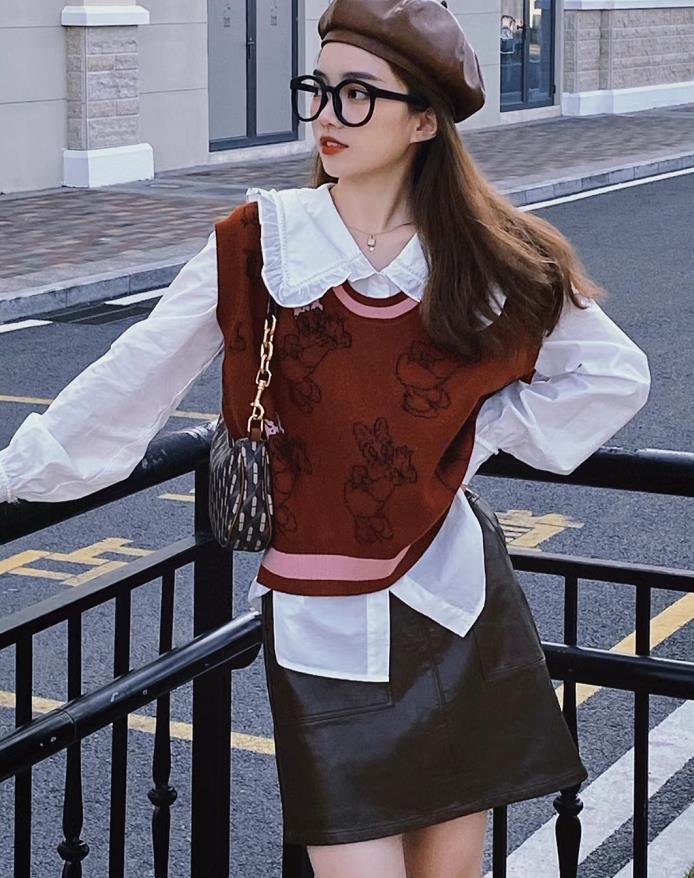 叠穿一件深色毛衣马甲,一简一繁的组合,就是好看呀~下身搭配一条深咖色半身短皮裙,这对于小个子女生来说,真的是太友好了。头上佩戴起来的贝雷帽,和裙子颜色还进行了呼应。