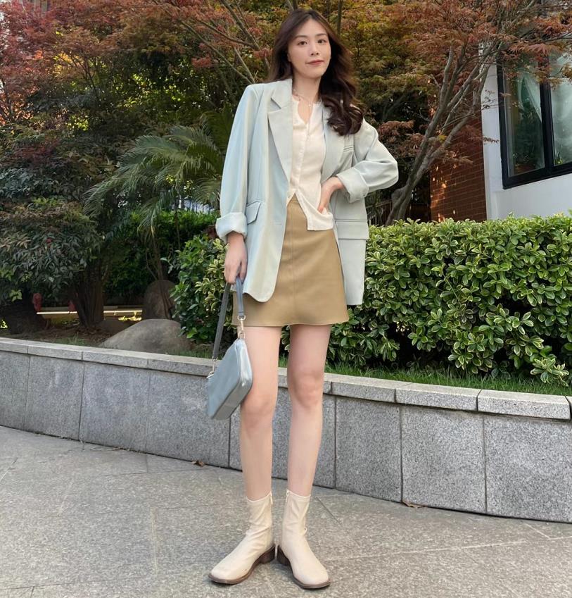 好喜欢这种卡其色啊,超级显温柔气质,对不对?卡其色的半身皮裙,它的版型是偏a字形状的,这有助于修饰胯宽和大腿粗的缺点,让你在视觉上呈现出高挑感。上衣内搭一件白色针织小衫,西装的颜色是薄荷绿色,这个低饱和度的配色,实在是太衬肤色显白了,超级减龄显嫩的,对不对?