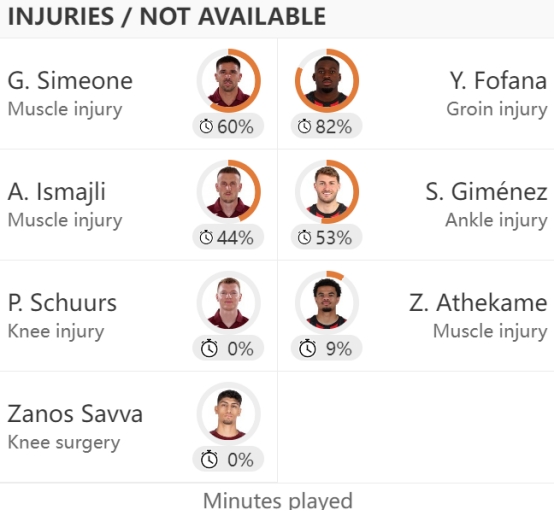 队内头号射手乔瓦尼·西蒙尼和阿尔巴尼亚国脚中卫伊斯马伊利有伤在身,均已连续缺席两轮。不过都灵的赛程倒是非常宽松。