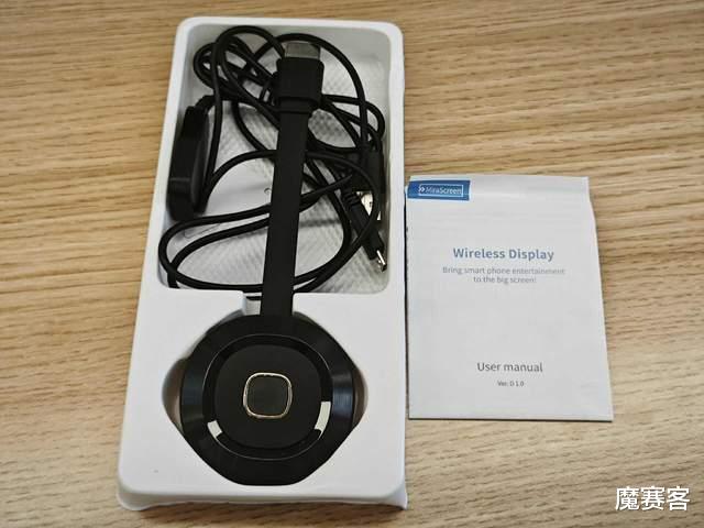 ▲打开包装可以看到中英文说明书,投屏器本体以及供电线。