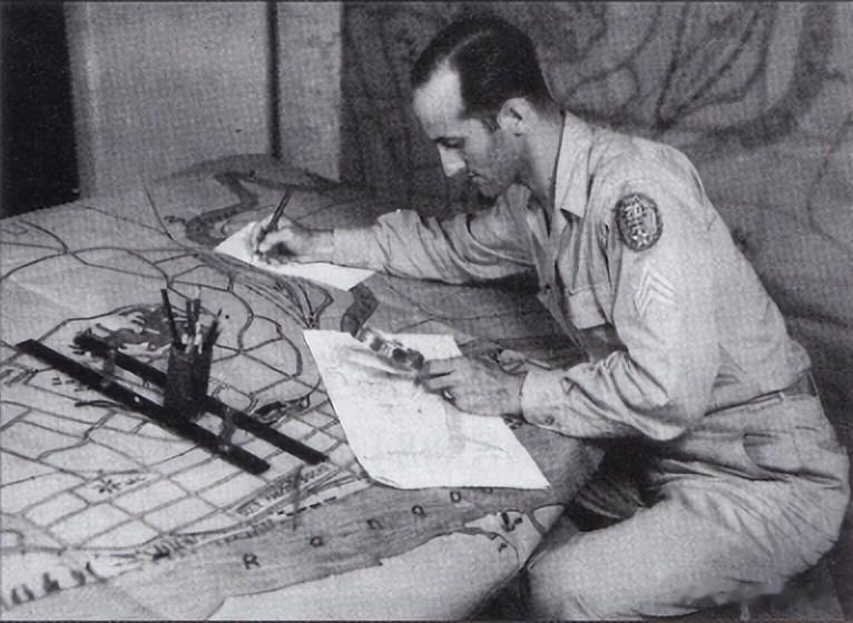 德菲卡参谋军士依据航拍照片和地图,准备目标地域——缅甸仰光铁路编组站的航路图。