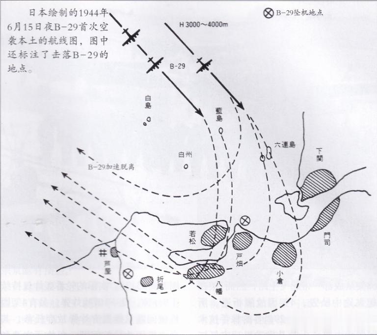 日本绘制的1944年6月15日夜B-29首次空袭本土的航线图,图中还标注了击落B-29的地点。
