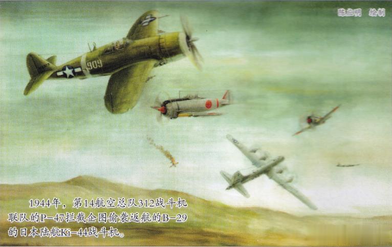 1944年,第14航空总队312战斗机联队的P-47拦截企图偷袭返航的B-29的日本陆航Ki-44战斗机。