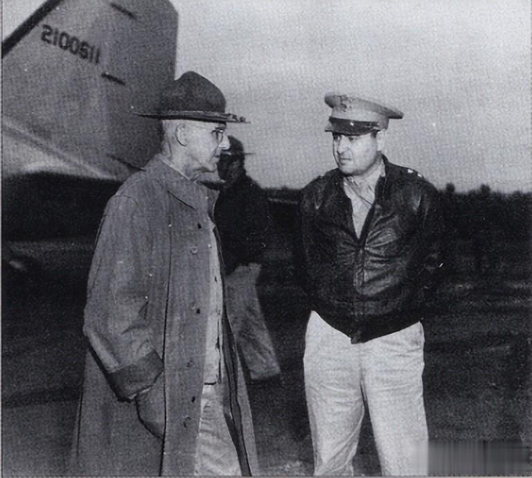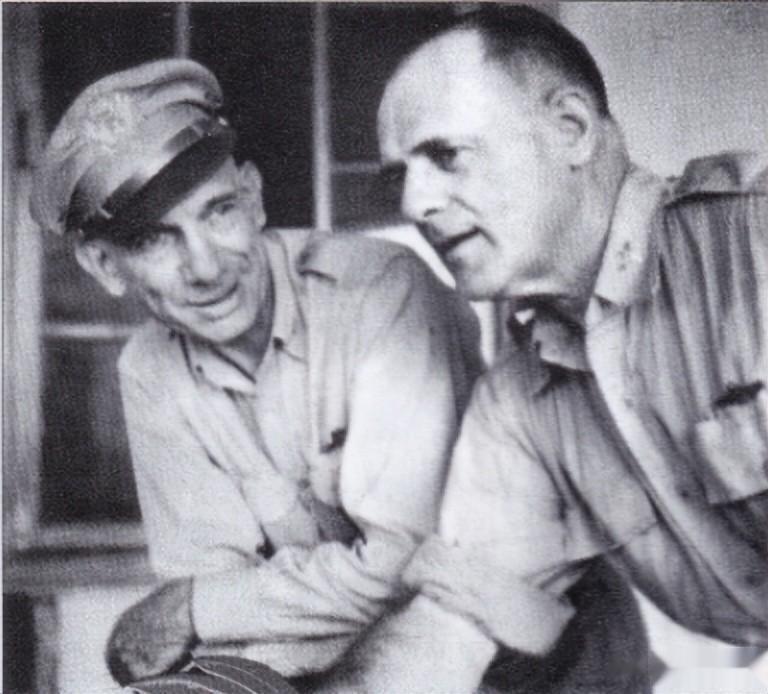 1944年10月11日,史迪威(左)与李梅在四川某B-29基地见面。