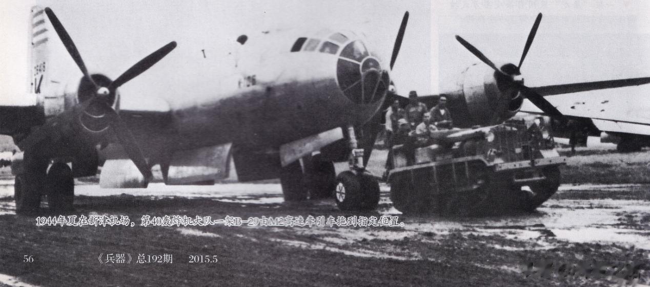 1944年夏在新津机场,第40轰炸机大队一架B-29由M2高速牵引车拖到指定位置。