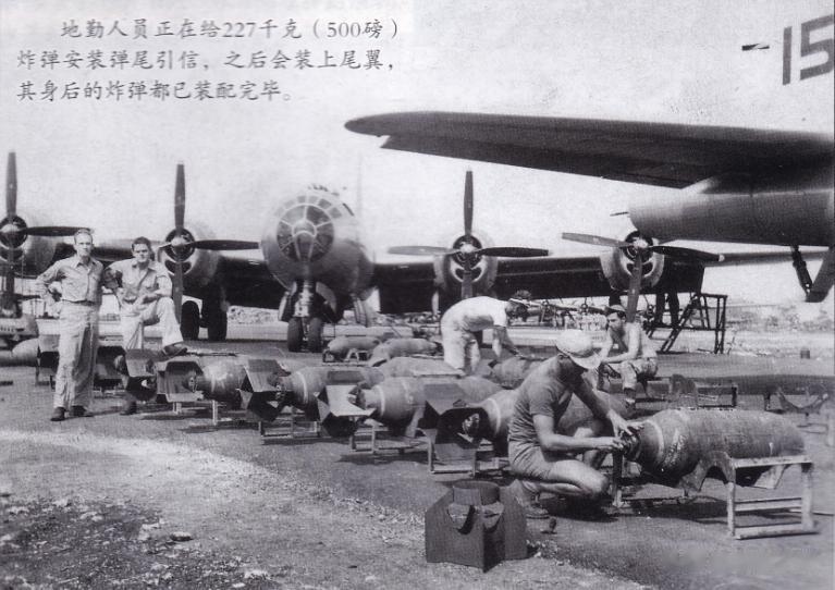 地勤人员正在给227千克(500磅)炸弹安装弹尾引信,之后会装上尾翼,其身后的炸弹都已装配完毕。