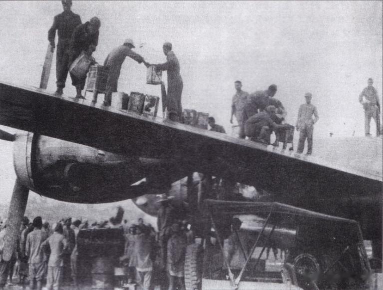 由于缺乏油泵等加油设备,中国地勤人员只能用18.9升(5加仑)油桶为B-29加油。