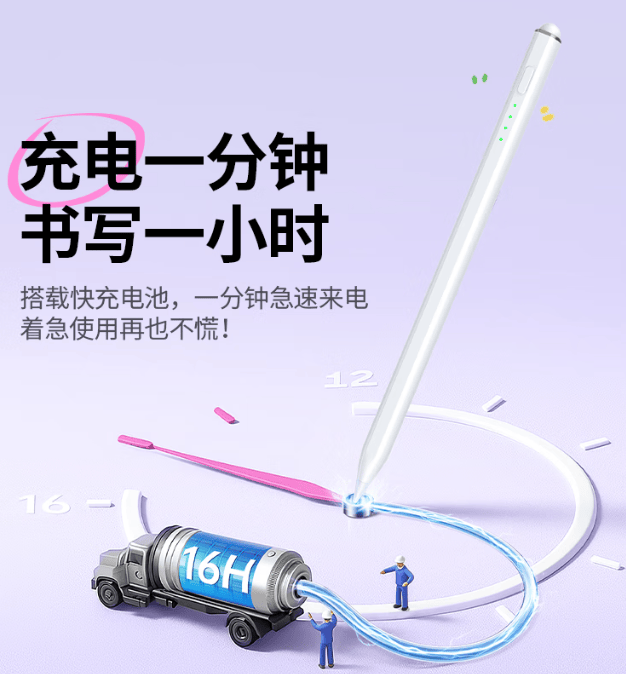 这款电容笔具备全局防误触功能,书写时即使把手放在屏幕上也不会出现断触的情况。在充电方面,它采用了磁吸充电,只需把电轻轻吸附到ipad侧面即可快速补电,大大提升了使用的便捷性。此外,连接到ipad还可以实时查看剩余电量,避免的电量焦虑,使用起来比较省心。在续航方面,满电后可连续使用8.5h,基本上能满足一天的写画需求。并且它还配备了倾斜压感功能,可以根据使用者调整电容笔的角度创作出不同粗细的线条,进行绘画创作时选择这款电容笔还是不错的。但需要注意的是这款笔兼容的ipad型号有限,购买前需要查看是否兼容自己的设备。