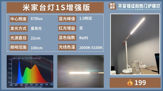 学生护眼台灯哪个品牌比较好用又实惠?米家台灯1S增强版延续系列简约风格,灯体为细窄条形设计,整体视觉干净利落。它采用约22厘米直发光面,功率9W,中心照度约678lux,仅达到国A级标准,照明范围约100厘米,更适合小型书桌,大桌面边缘易出现照度不足。操作支持旋钮与米家APP互联,也可配合语音控制,接入智能家居较方便。不过直发光导致光线集中,UGR防眩指数在19以上,眩光较明显,对光线敏感者不是很友好。