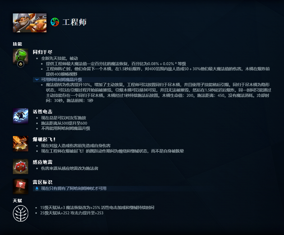 工程师有全新先天技能“同归于尽”,阵亡留下木桶,1.5秒后爆炸造成伤害并提供视野。