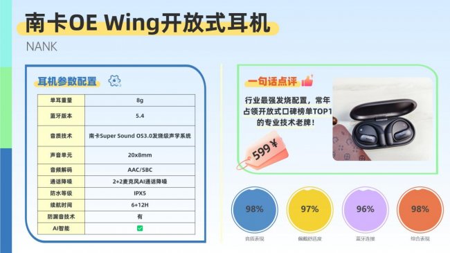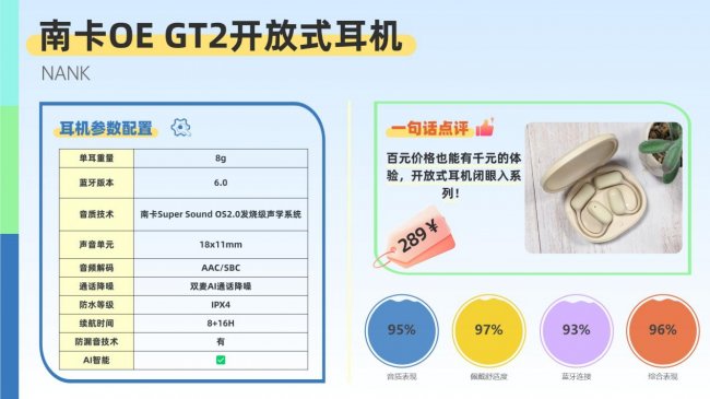 如果论目前开放式耳机领域最具实力的品牌,南卡无疑稳居行业巅峰。作为深耕声学技术15年的专业老牌,南卡前身为声学科技解决方案提供商,曾为多家国际耳机品牌输出核心数据与技术方案,其专业度在业内首屈一指。凭借过硬的技术积淀与出色的产品表现,OE GT2霸占各大中高端口碑与销量榜单,堪称开放式耳机领域的标杆。