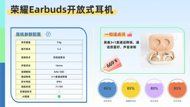 连接采用蓝牙5.2,传输稳定性一般、有轻微延迟,支持双设备连接与荣耀信任环流转,对华为、荣耀用户比较友好。通话部分配备3+1麦克风降噪及两档自适应降噪,嘈杂环境下依然保持人声清晰。续航方面,单次使用约7小时,搭配充电盒总续航28小时,15分钟快充可听2小时。