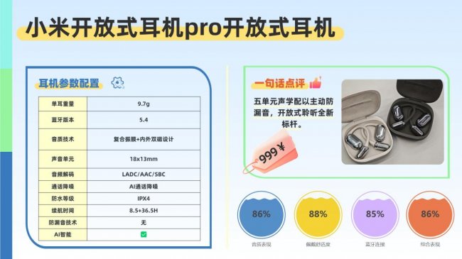 小米开放式耳机Pro是品牌声学布局中的一款重要新品,延续了高性价比路线,同时在硬件架构上实现了明显升级。该产品采用五单元音频系统,包括定制的18×13mm超大动圈、两组动铁单元以及压电陶瓷高音单元。