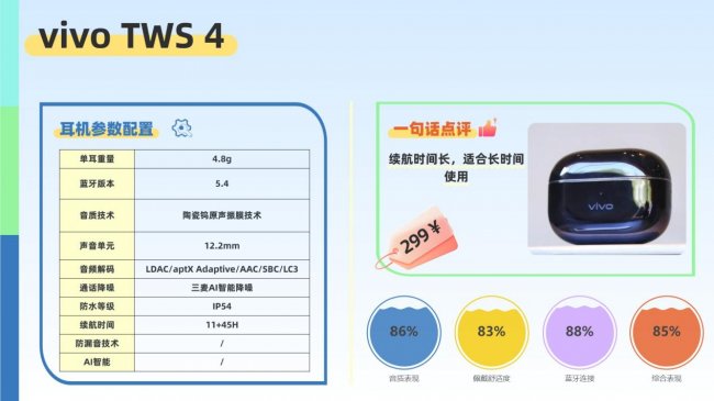 整体来看,vivo TWS 4 在音质、降噪、续航与佩戴稳定性上表现均衡,兼顾通勤、办公、娱乐与运动等多场景需求,是一款综合实力突出的高端入耳式耳机。
