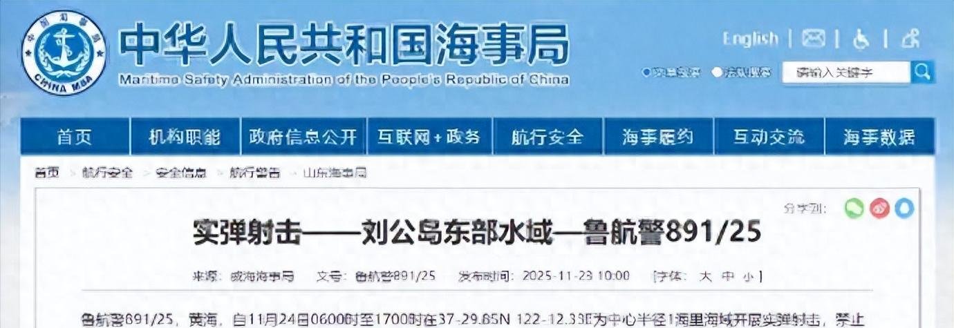 说实话,我本来只是想来威海散散心的。谁曾想,刚到就碰上这么个"惊喜"——威海海事局的一则通告,编号"鲁航警891/25",简单粗暴地宣布:11月24日,黄海某海域要"关门打狗",从早六点到晚五点,整整十一个小时,禁止任何船只靠近。我随手画了个圈,好家伙,正好圈在刘公岛东边。这个地方选得,啧,真是讲究。