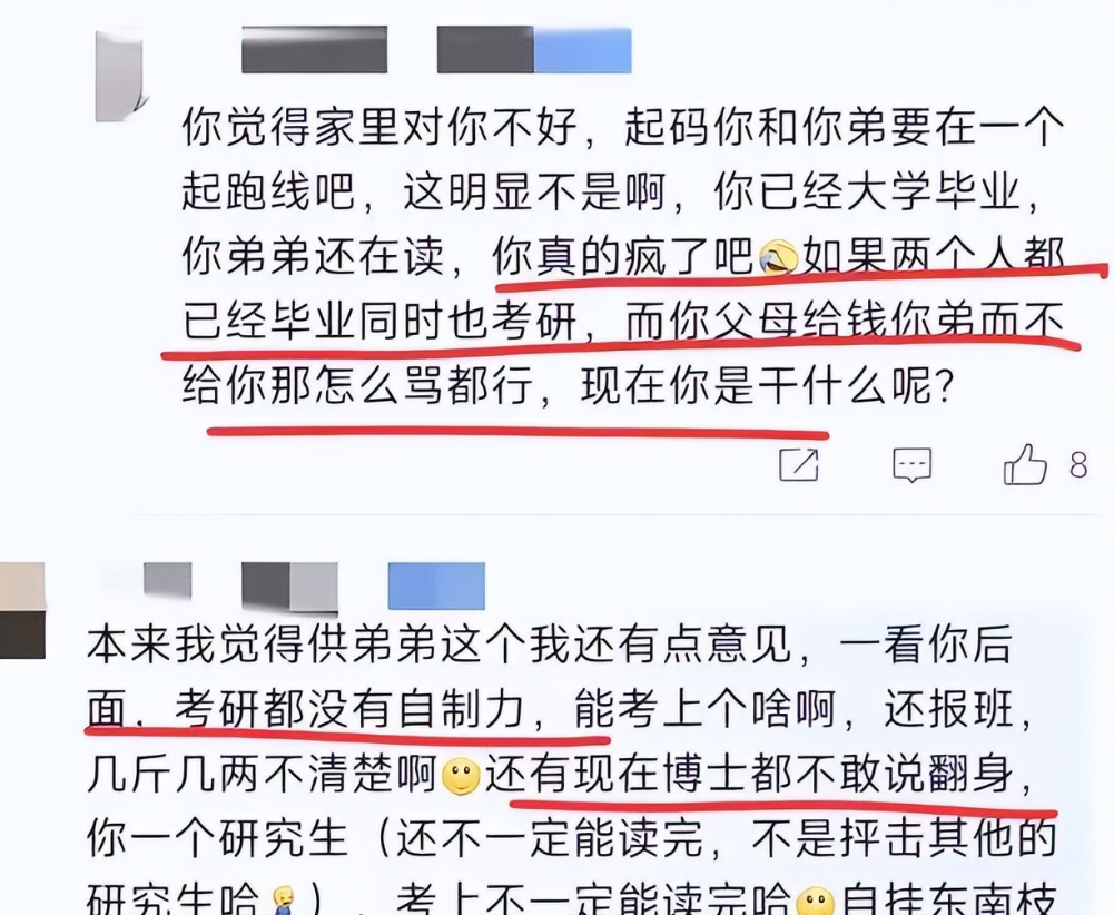 与此同时,网上有个考研女孩也火了。她在网上哭诉,说自己想考研,但自控力差,必须花几万报辅导班,还抱怨父母因弟弟也要上学拿不出这笔钱耽误她的梦想。可细听才发现,她不是缺机会,而是懒得自律,想让父母为自己的不努力买单,难道考研非得报一个几万元的辅导班才是必经之路吗。一边是挑着扁担说"我能行"的姑娘,一边是哭着喊"爸妈得帮我"的女孩,这对比像面镜子,照出了两种完全不同的人生态度。