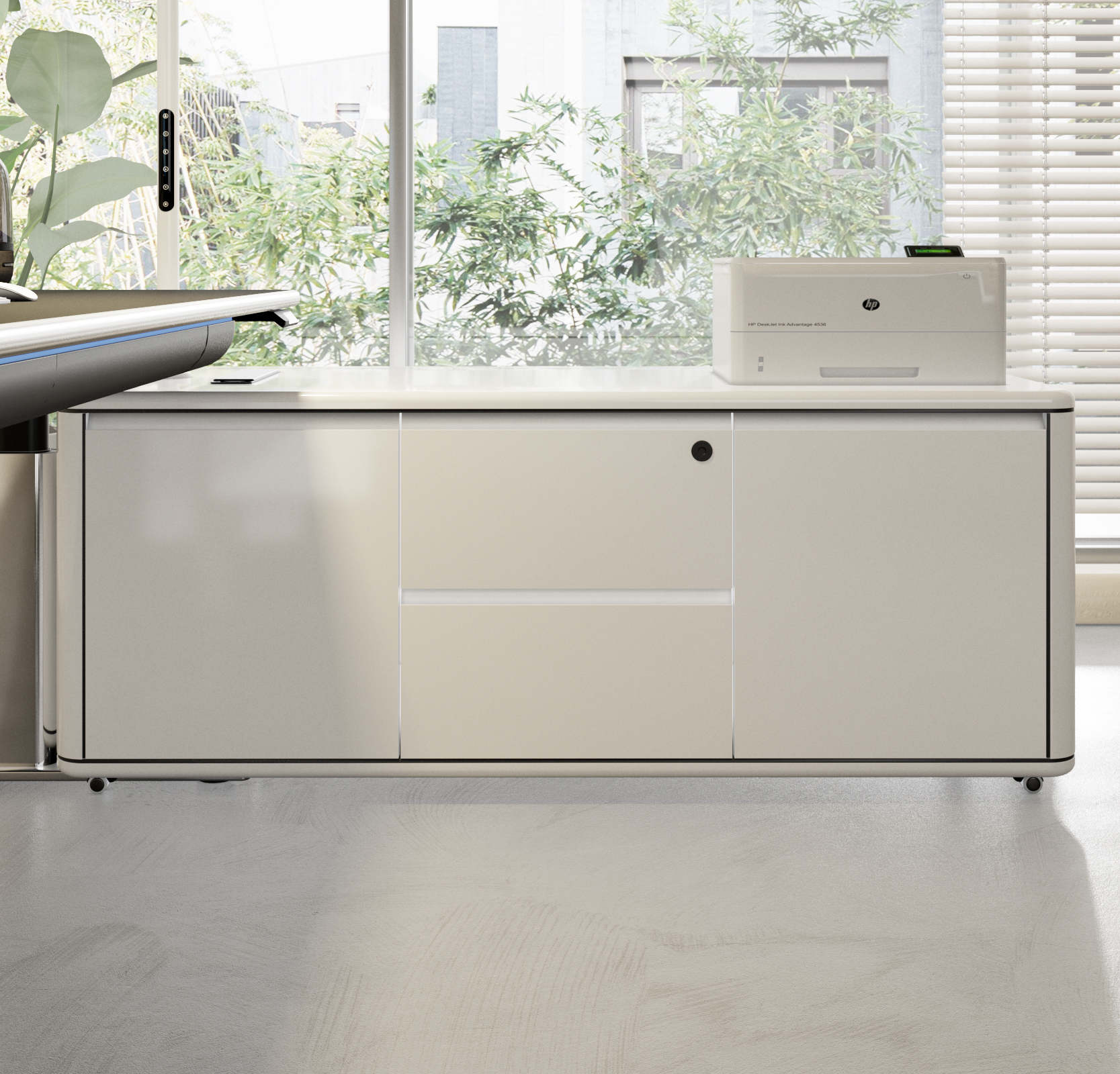 •智能边柜:配备指纹解锁功能,双开门设计 + 两个大容量抽屉,可安全存放合同原件、U盘、数码设备等私密贵重物品;柜子顶部集成强弱电充电插座,打印机、碎纸机等设备可就近供电,无需额外牵拉长线,优化办公动线。