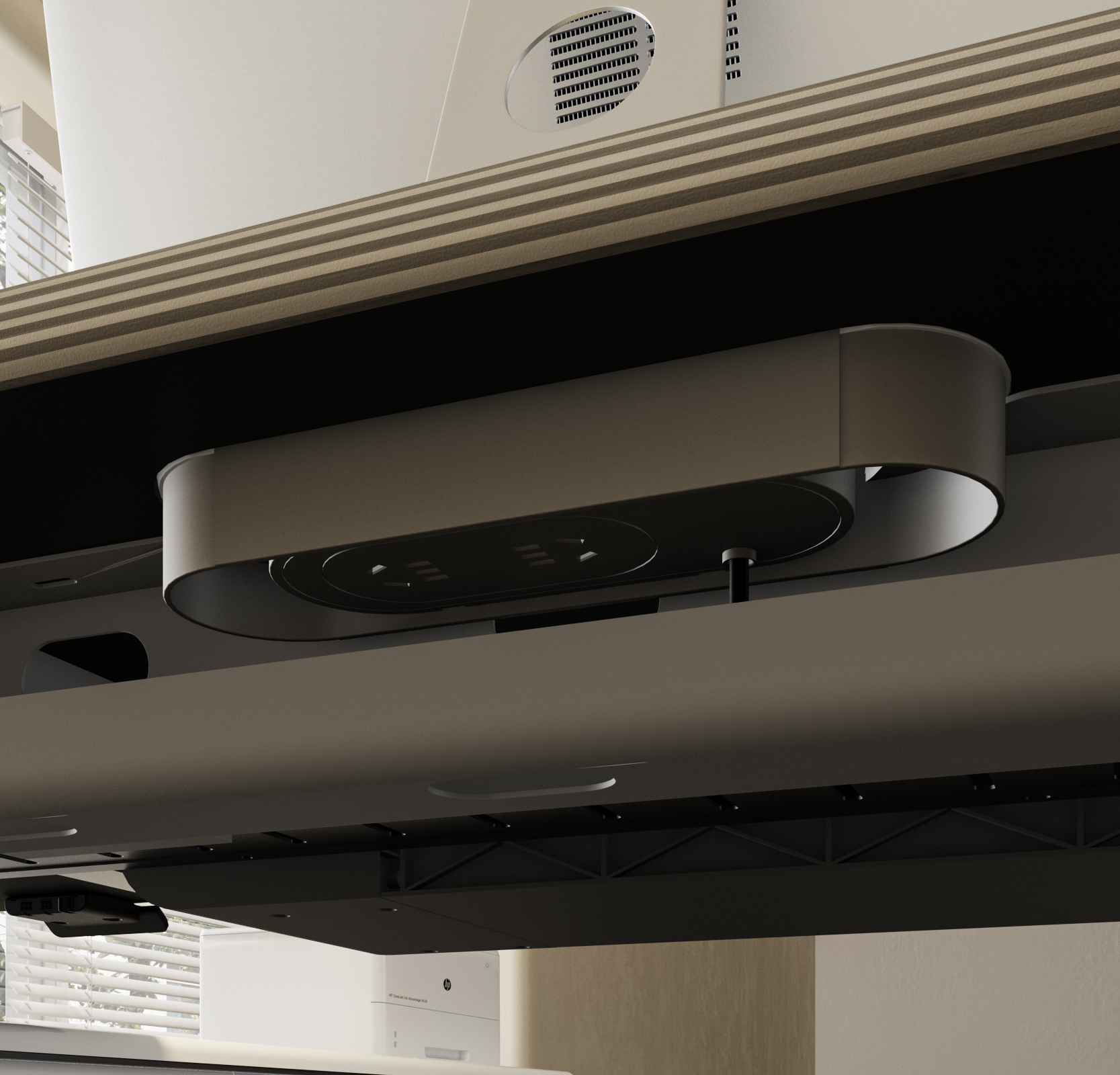 •高端办公场景:调节至 75~80cm 高度,台面可轻松容纳双27寸显示器+笔记本电脑+文件架+小型绿植,隐藏理线槽让线缆完全隐形;加装吊柜后可收纳常用办公资料,智能灯带在视频会议时营造专业氛围,客户来访洽谈时,整洁的台面与科技感细节能直观传递企业专业度与品质追求。