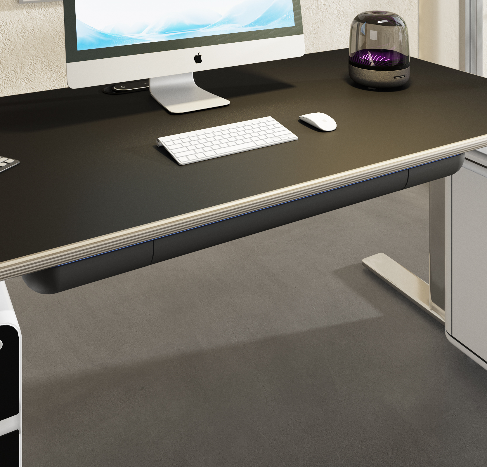 •文具抽屉模块:抽屉上方集成智能联动灯带,支持与电脑屏幕连接,可同步拾取画面全彩灯光,也能随会议音量、背景音乐节奏律动,为严肃办公场景注入恰到好处的科技质感,不显浮夸。