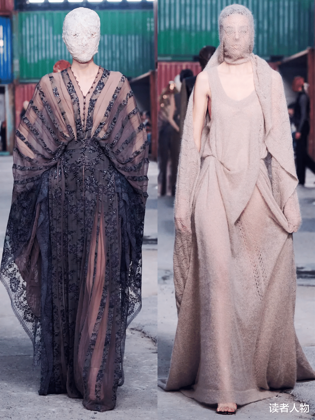 因为戴着头套视野受限,再加上秀场地面是坑洼不平的水泥地,模特们走得那叫一个小心翼翼、步履蹒跚。