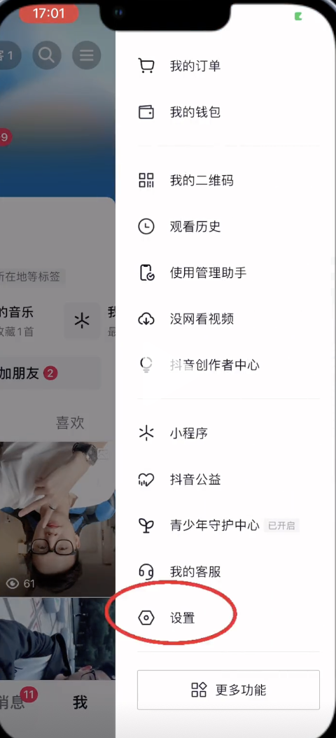 首先我们要用另外一台手机去注册一个抖音号,然后登录上去。登录完成之后,点击右下角这个我的,然后再点击右上角这个三条杠往下找,找到设置。