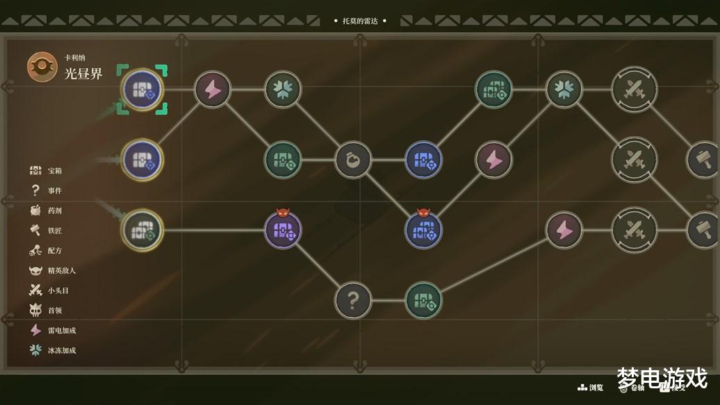 游戏的整体玩法由三个部分构成,分别是肉鸽战斗+背包管理+模拟经营,大概就是白天开店晚上冒险这样的循环机制。肉鸽战斗与背包管理都是在探险过程中的玩法,游戏下地牢类似于爬塔,箱庭式的房间连接,有路线选择,能看到房间内的奖励类型,像是宝箱、BUFF、奇遇、篝火等。