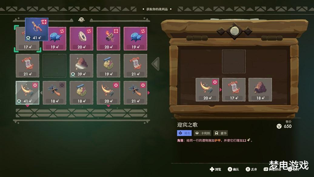 背包管理方面看似只是寻宝和经营中间普通的一环,但实际游玩来说却是最重要也最好玩的一环,经常在管理背包的时候思考的过程比清一房间怪还耗时更久。游戏中不是背包管理简单的选择这个丢弃那个,而是像排列序号组合那样子,宝物除了普通的稀有度区别,更多的则是相互之间的效果。