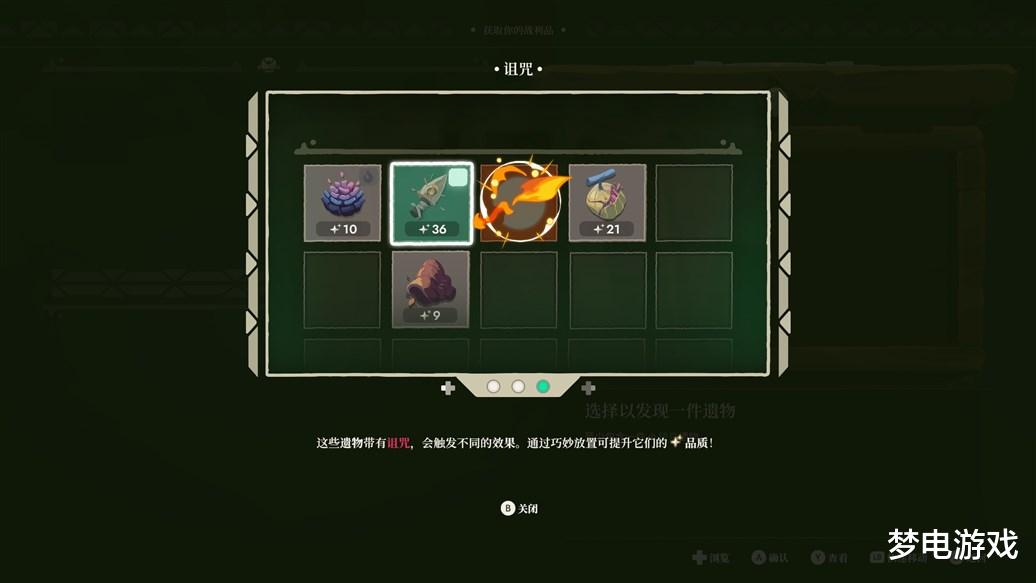 很多遗物会携带奇奇怪怪的诅咒,比如燃烧、电击左边的遗物、为相邻的遗物增加价值、吸收复制每一类型的遗物等等;而且这种诅咒的生效情况也有很多种,有的是一放进背包就生效,有的则是放在角落生效,有的要放在第一行或者最后一行生效,但玩家暂时不想使用这个诅咒的时候,就要避开生效位置来排列;不仅如此,不同地图的遗物又有特别的规则,燃烧与保护、电击与过载、吸收与石化。