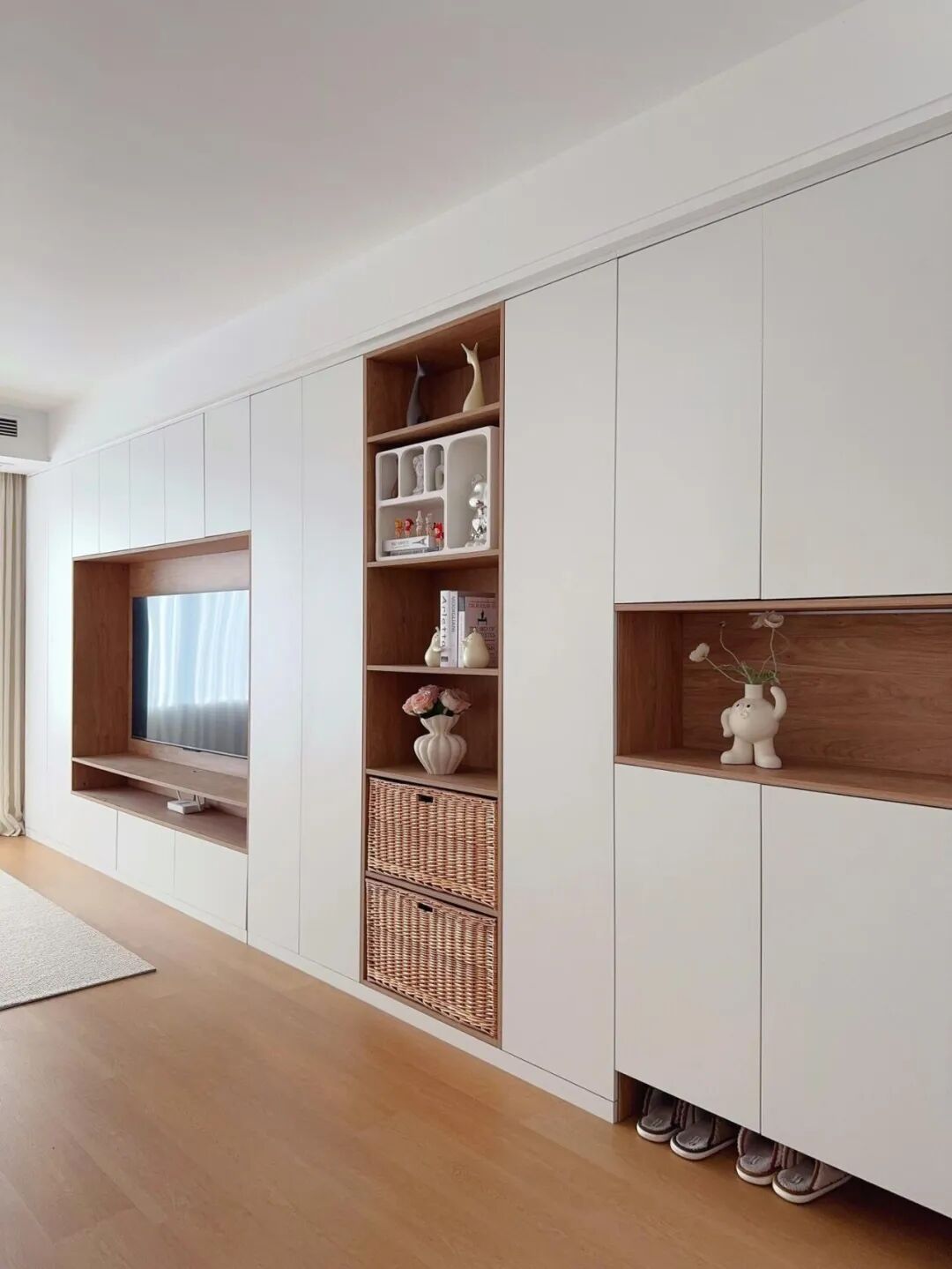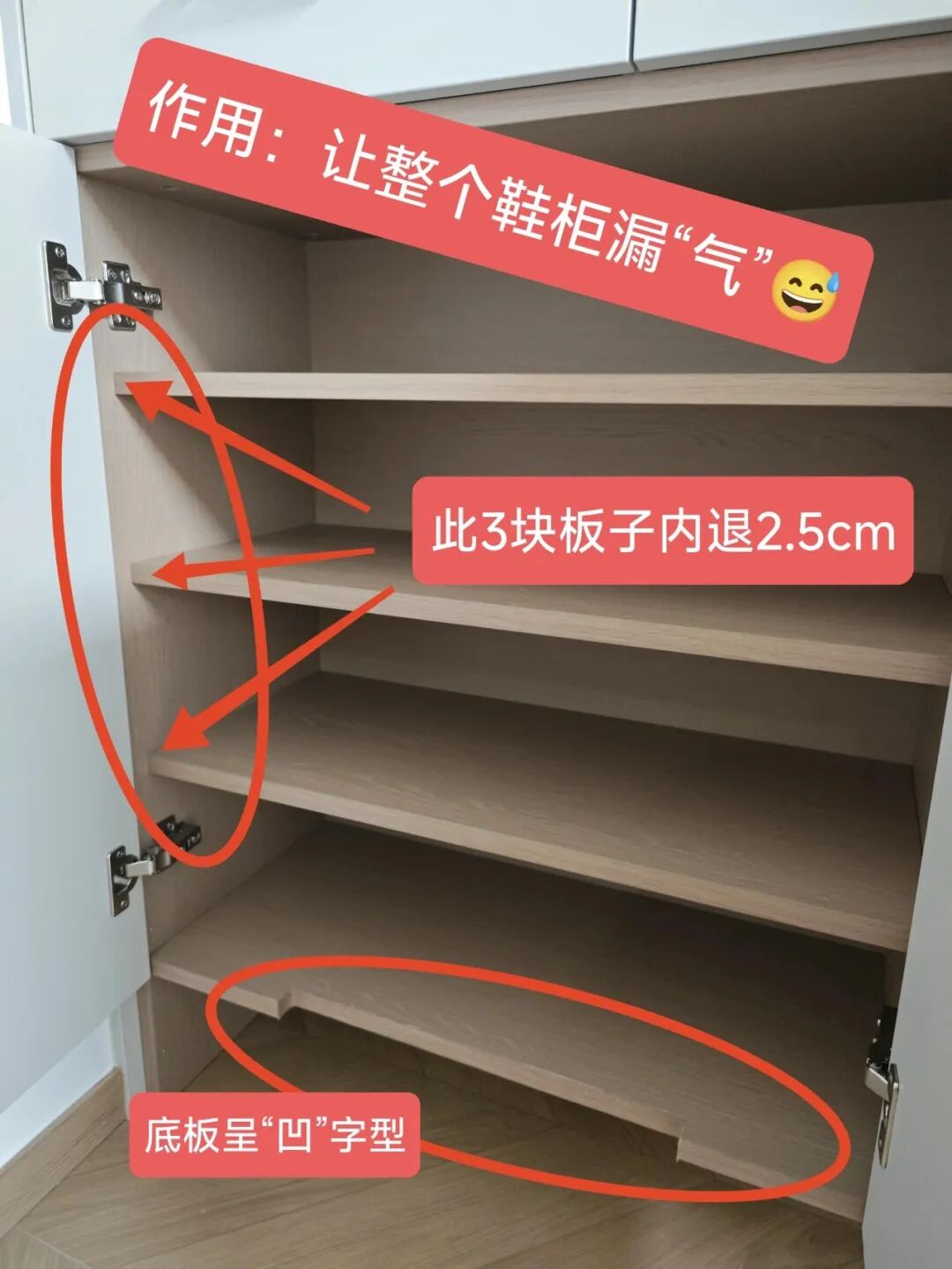 特意要求全屋定制,将家里鞋柜上方层板统一内退2.5cm,最下层的底板内凹,让空气能流通,鞋子能透气,但不漏鞋底灰。