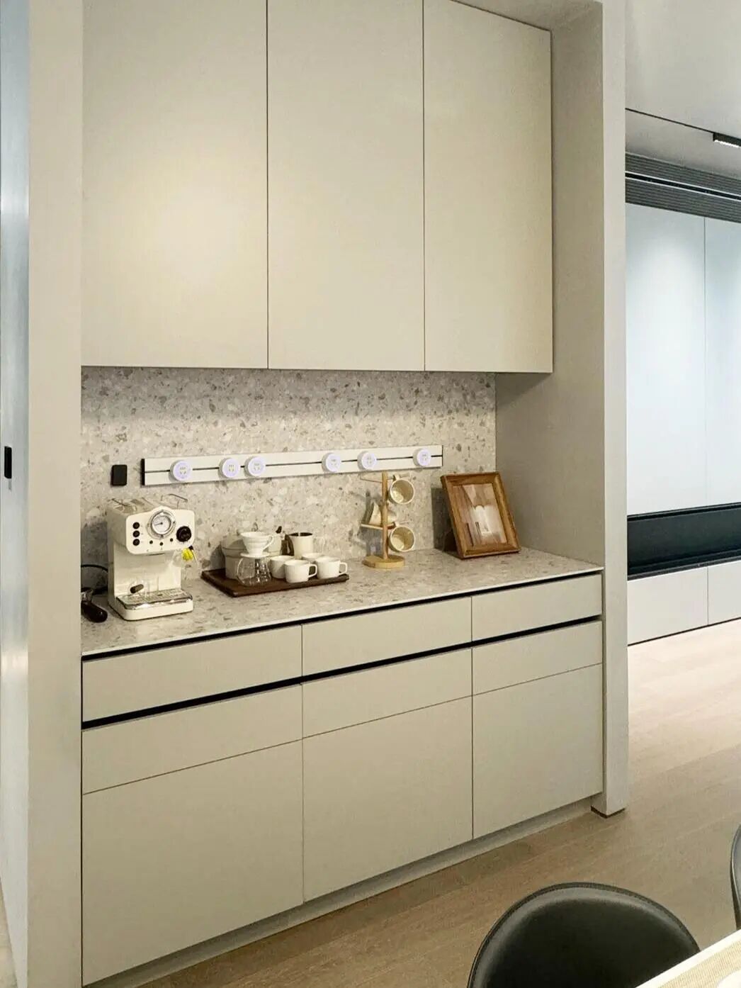 网友@极简说 家里的餐边柜兼水吧台,做了两排抽屉,第一排浅抽,可以放咖啡、茶。高抽储放零食、餐具、杯子,不仅好看还很实用。
