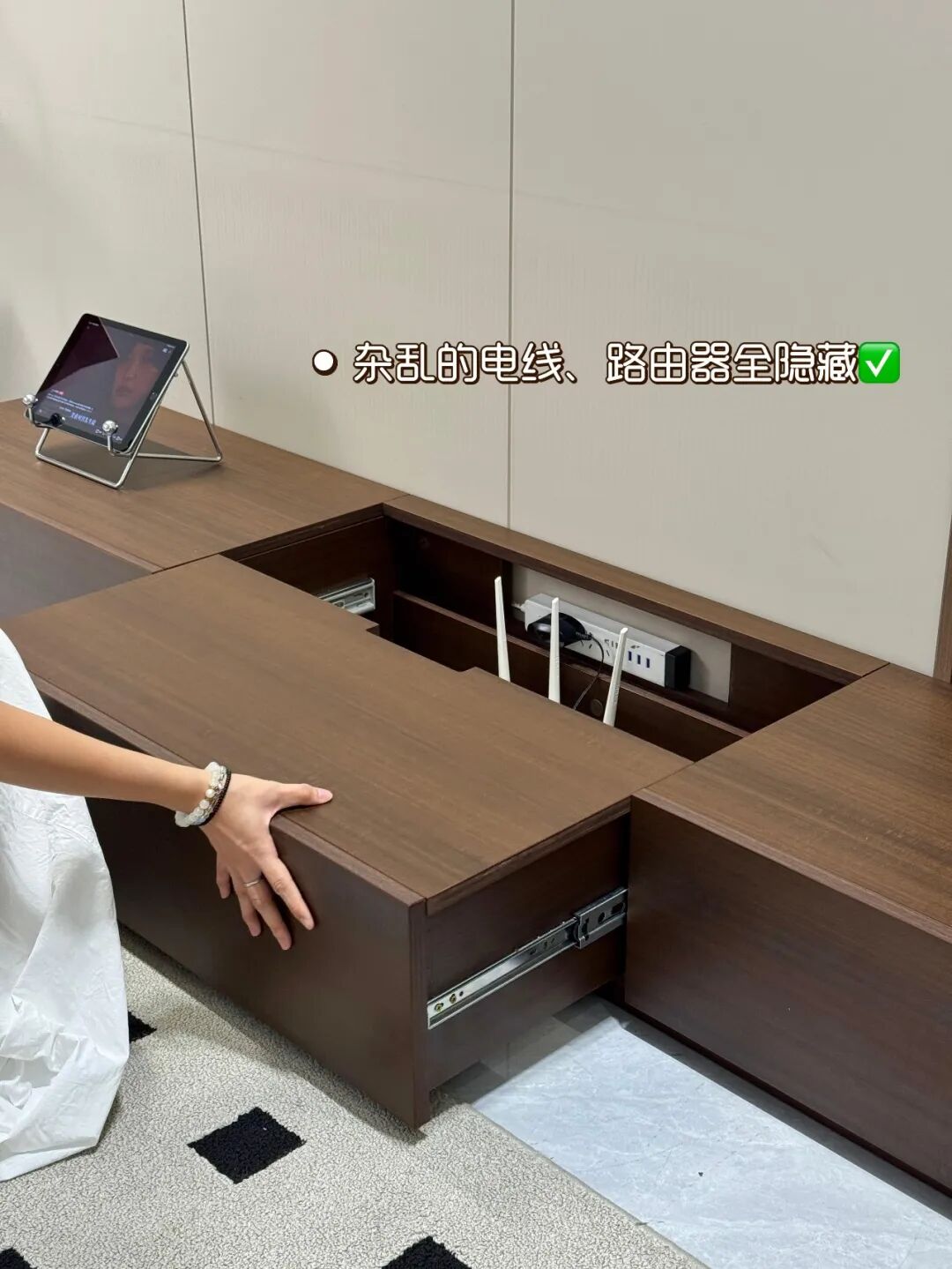 把电视柜抽屉倒着来装,抽屉用的是滑轨设计,电线和路由器直接隐藏在柜子里,电视墙这块瞬间美观整洁了。