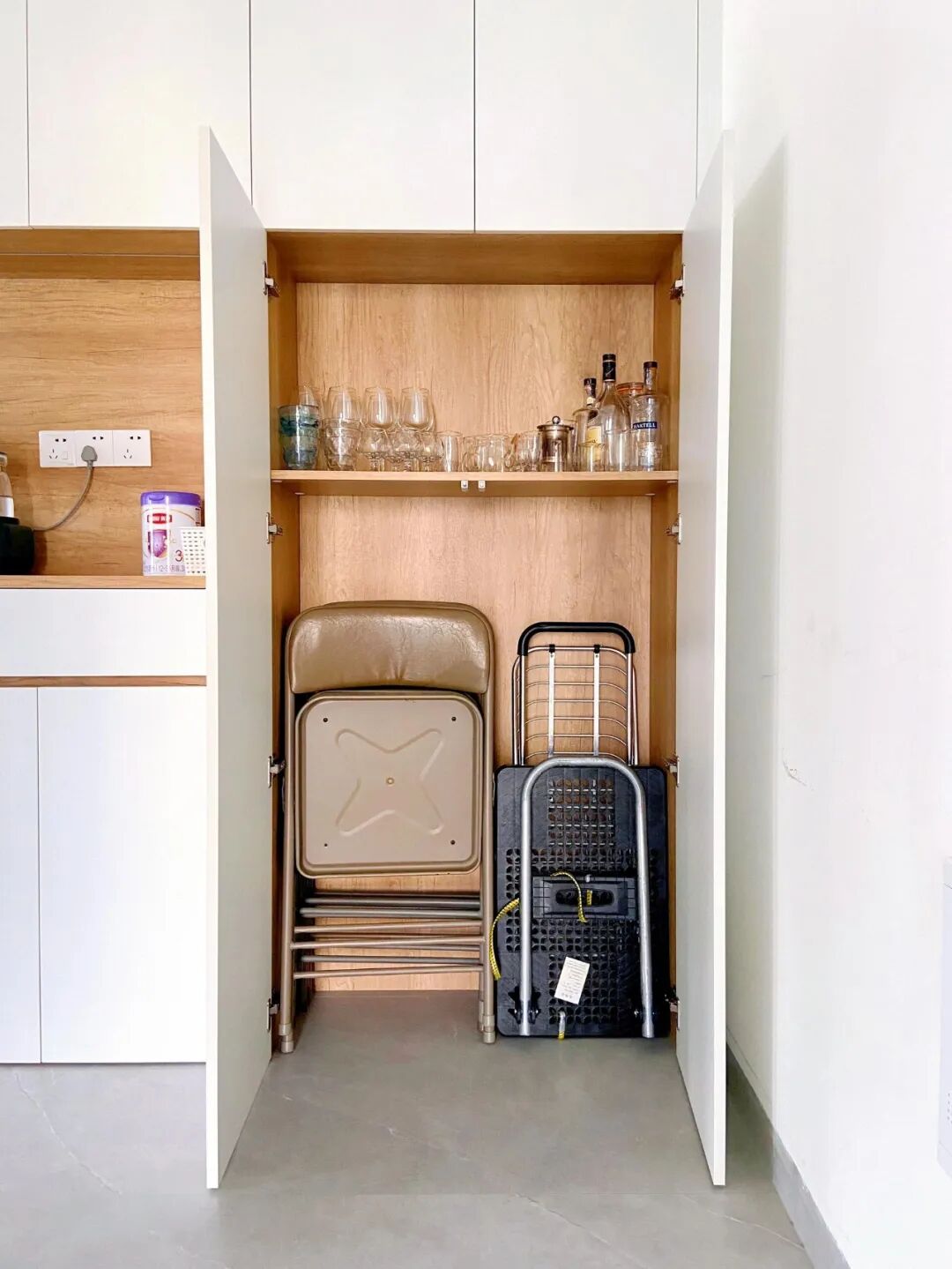 较重的酒水、饮料也能落地放在留空处,关上柜门,瞬间藏得严严实实,客厅干干净净,看着就舒服。