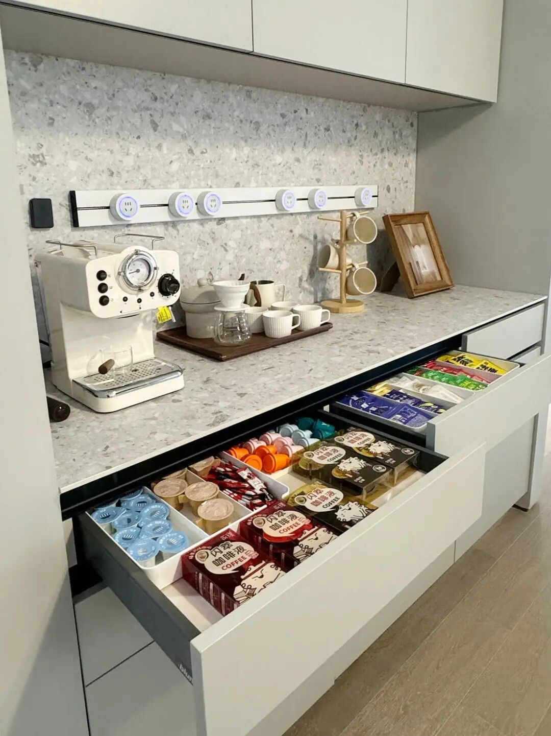 有了抽屉,就能实现精细化分区,茶叶、咖啡放一个抽屉,餐具放一个抽屉,零碎杂物分门别类,再也不用堆在台面上。