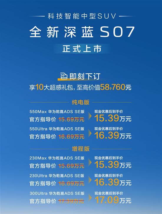 与此同时,官方推出了10大超感礼包,至高价值58760元;全新深蓝S07预售用户(含已交付客户)叠加享受超感膨胀礼999元抵3999元(详情请咨询当地经销商)。