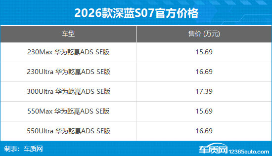 2026款深蓝S07正式上市,售价15.69-17.39万元。新车针对颜值、智能、动力和驾控全面升级,提供增程和纯电双选择。增程版纯电续航最高300km,综合续航达1385km;纯电版续航550km。全系标配高通8295P芯片和华为乾崑智驾ADS SE系统,支持多场景智能辅助驾驶。车内配备零重力座椅及律动氛围灯,舒适科技感十足。更搭载同级少见可变自适应悬架,兼顾操控与舒适。整体产品力扎实,是一款高性价比的智能电动SUV。