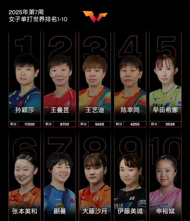 王艺迪、陈幸同、日本早田希娜、张本美和排名3-6位,新加坡大满贯获得女单亚军的国乒小将蒯曼排名上升八个名次位列第7,日本大藤沙月、伊藤美诚、韩国申裕斌均下降一个名次位列第8-10。