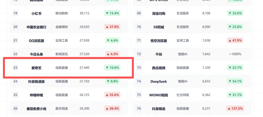 根据极光月狐的数据,2026年3月手机应用(非游戏)TOP100榜单里,爱奇艺排行为23,MAU(月活跃用户数量)为27440,年下降16%。平台多次调整会员定价体系、推出阶梯式收费模式,却并未同步优化观看体验,站内广告泛滥、强制弹窗、超前点播争议等问题长期存在,直接削弱用户续费意愿,核心营收基本盘持续承压。