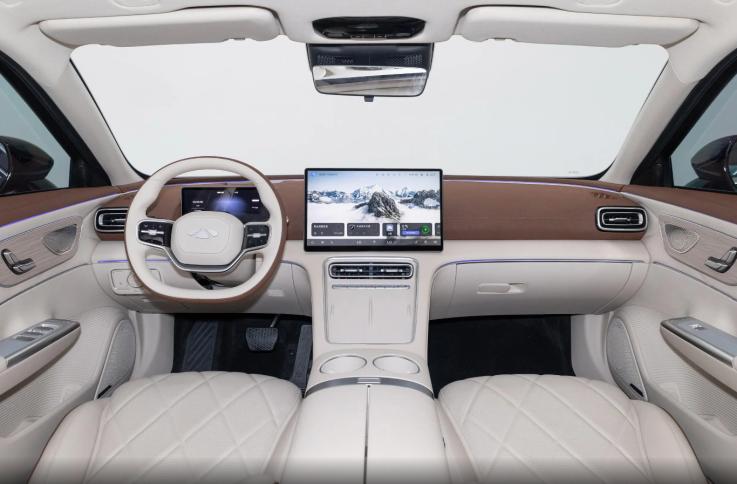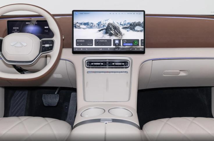坐进车内,风云A9采用双色内饰设计,实拍车型为咖色、奶白色双拼方案,上层均采用暖咖色软性材质包覆,下层则采用奶白色面料进行填充,身体易接触的区域均采用镀铬银色元素涂装点缀,整体氛围感较为高级,相较于现款汉DM的内饰而言,更倾向于营造现代简约的居家气息。在座舱科技配置方面,新车采用常规的双屏布局,液晶仪表和中控屏均采用悬浮式设计,屏幕边框较窄,尺寸适中,预计车机将继续搭载Lion OS系统,而为之提供算力性能的芯片将升级为骁龙8255。