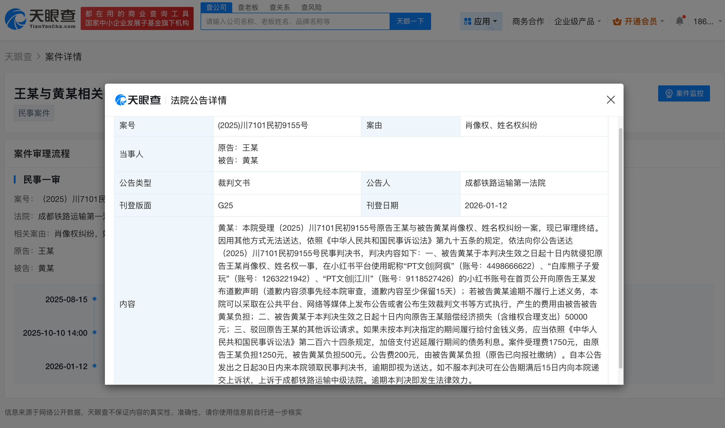 天眼查法律诉讼信息显示,近日,成都铁路运输第一法院刊登原告王一博与被告黄某肖像权、姓名权纠纷一案民事判决书。判决内容显示,被告黄某被判向王一博公开道歉,赔偿经济损失(含维权合理支出)5万元。