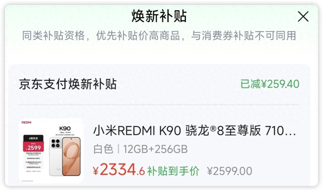 最近网上经常听到红米K90销量不及预期的声音,结合最近京东“补贴”发力,在每个人都可以领取的这种补贴下,红米K90的价格从2599来到了2334.6元,看来红米K90的市场表现应该是没有那么乐观,但这并不是友商的竞品有多强。