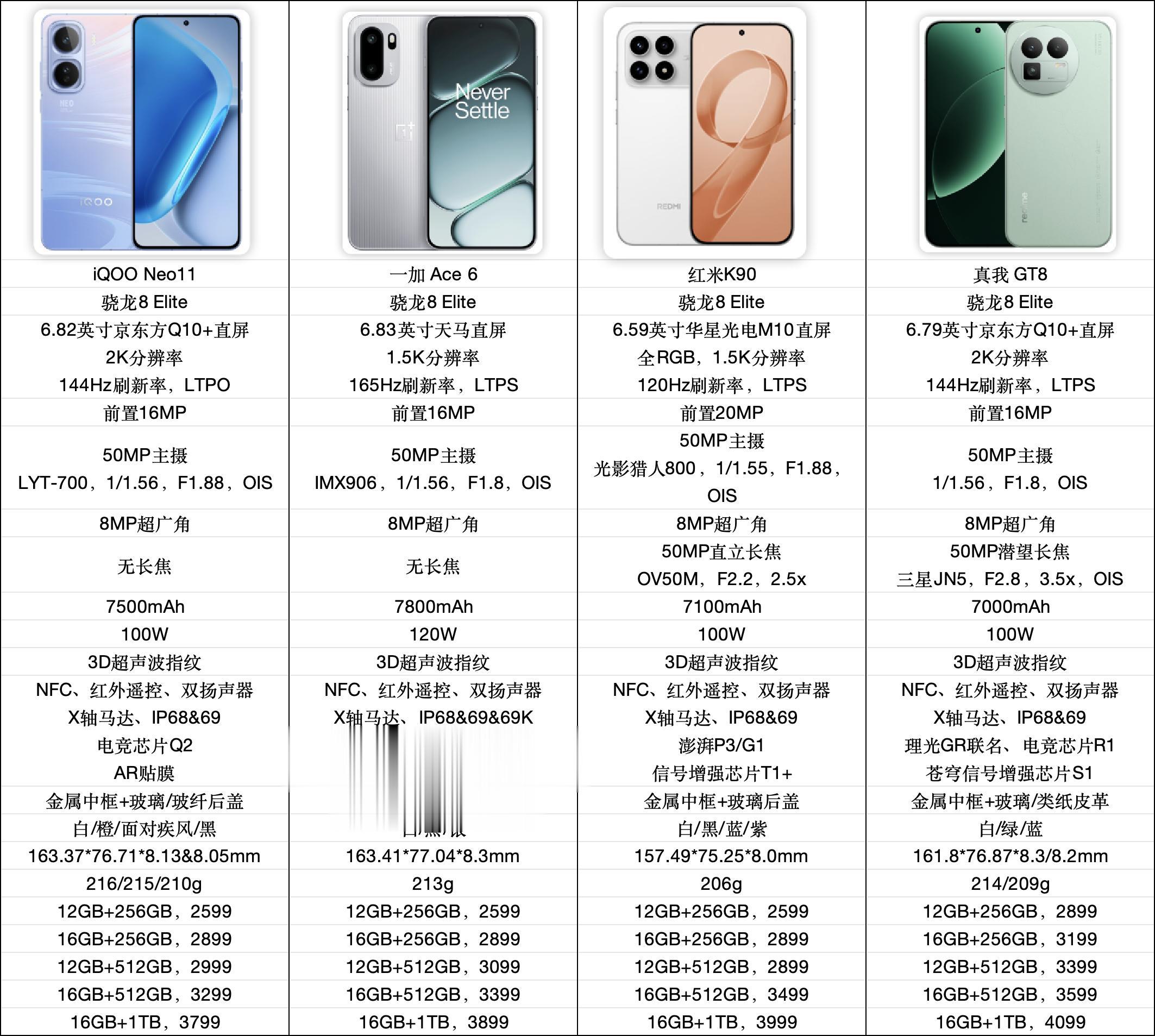 将iQOO Neo11、一加Ace 6、真我GT8和红米K90这四款产品进行简单对比,可以发现真我GT8的整体搭配的确更强,但其2899的起步价比另外三家贵了300,这个差价可以直接Out了。