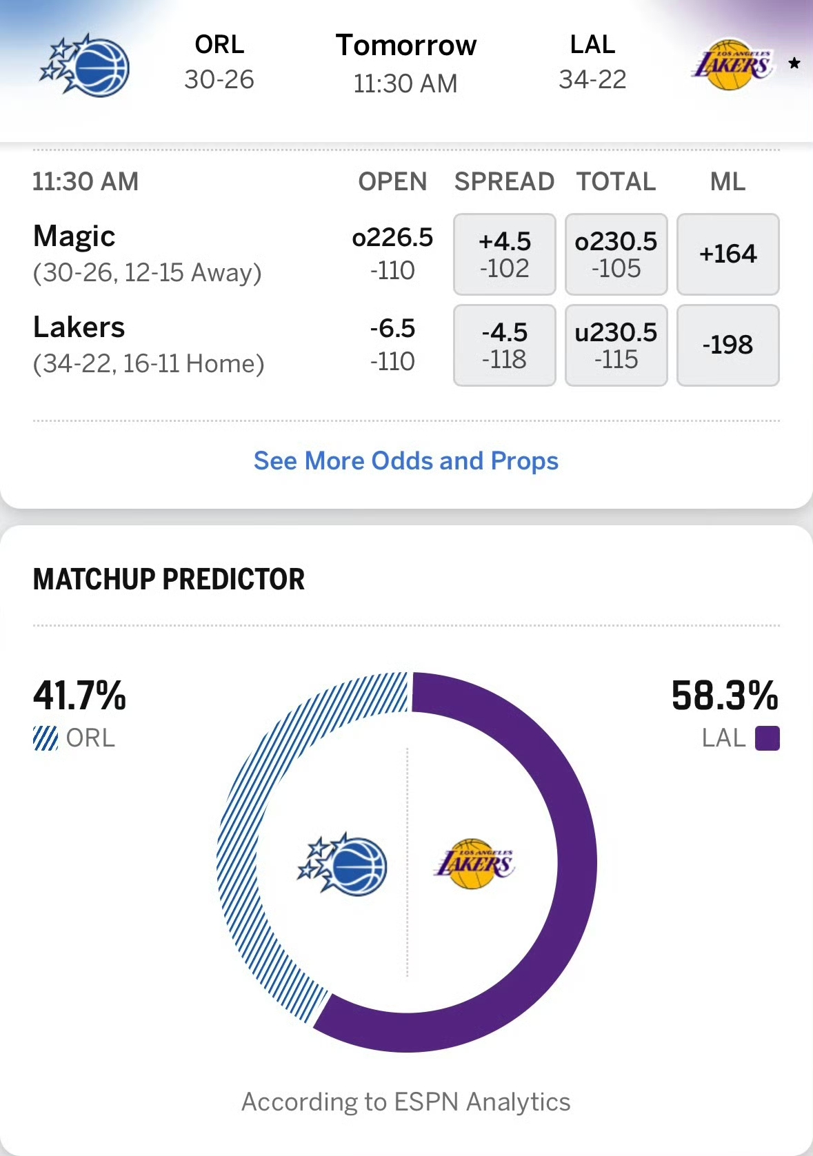 明天上午11点30,湖人要在主场迎战魔术了。虽然内线大闸海斯大概率打不了,但ESPN还是更看好湖人,给出了58.3%的胜率。