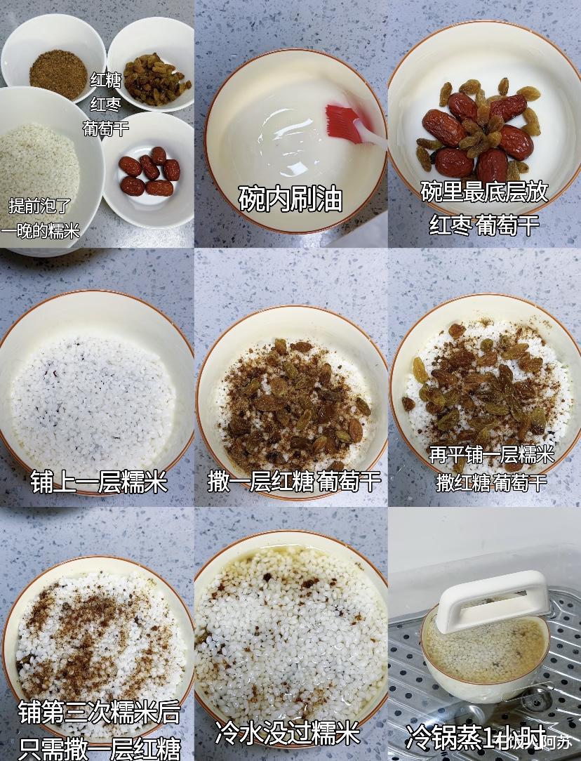 接着开始铺层。在碗底铺上一层红枣和葡萄干。你可以发挥创意,将红枣去核后剪成小块,与葡萄干一起摆出喜欢的图案。铺好底层后,取一部分沥干水分的糯米,均匀地铺在红枣和葡萄干上,用勺子轻轻压实。然后,在糯米层上撒上一层红糖,再点缀一些葡萄干。重复这个步骤,一层糯米一层红糖,直到将所有食材铺完。最顶层撒上厚厚的一层红糖,这样在蒸制过程中,红糖会融化并渗透到每一粒糯米中,使其充分吸收甜味。
