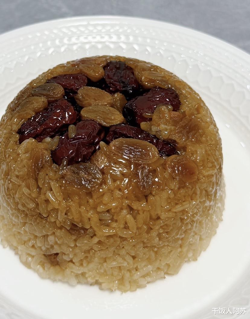 做好的红糖糯米饭,红枣的香甜、葡萄干的酸甜与糯米的软糯完美融合,红糖的醇厚甜味贯穿始终,每一口都让人感到无比满足。无论是作为早餐、下午茶还是饭后甜点,它都是一道绝佳的选择。这道甜品不仅美味,还寓意着生活甜甜蜜蜜、红红火火,非常适合在家庭聚会或节日庆典时制作,与家人朋友一同分享这份甜蜜与幸福。