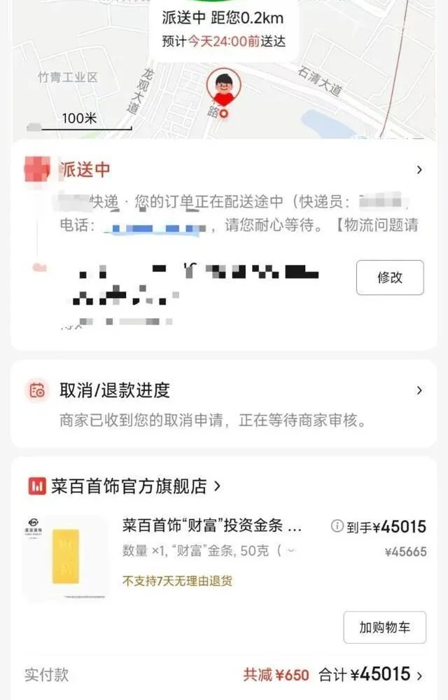 一名男子在网上购买了50克金条,下单后第二天黄金价格上涨。然而,就在订单处于派送环节时,他发现订单被商家突然取消,且相关订单记录已被删除。该男子表示,在尚未收到金条时,已提前以最新市价将其卖出,订单取消导致他面临额外损失。他向平台反馈后,平台仅提出补偿200元的解决方案,无法弥补其实际损失,双方就赔偿问题未能达成一致。