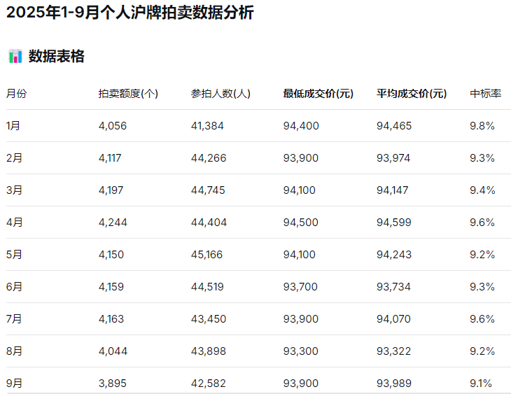 以下是2025年1-9月个人沪牌拍卖的关键数据,供参考: