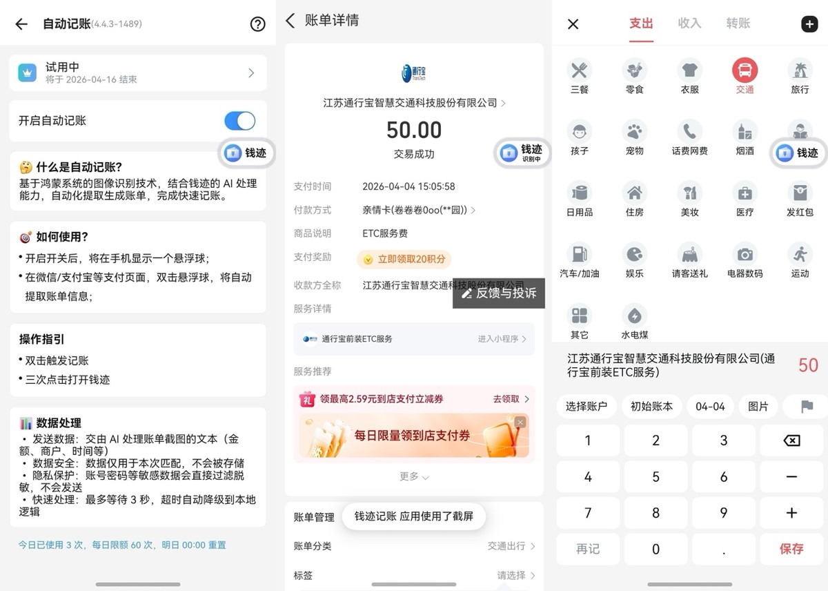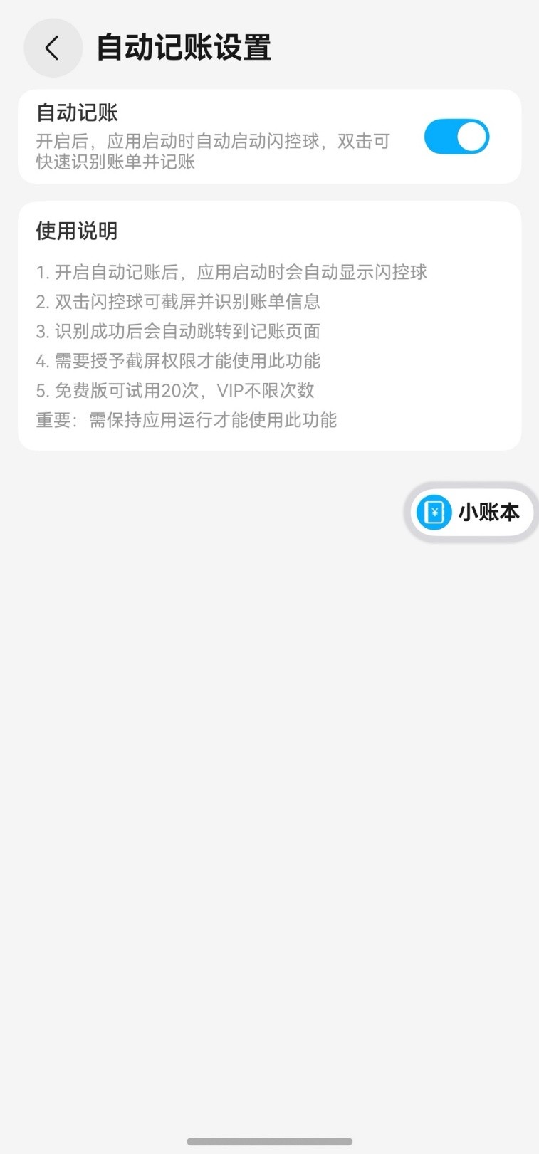就拿鸿蒙版钱迹记账说吧,在设置里开启自动记账功能后,屏幕边上会出现一个悬浮的闪控球。点击一下这个闪控球,它就会自动识别屏幕上的金额和商户名称,我只需要确认一下就能保存,这一条账目就这么水灵灵地生成了,整个过程也就两三秒。