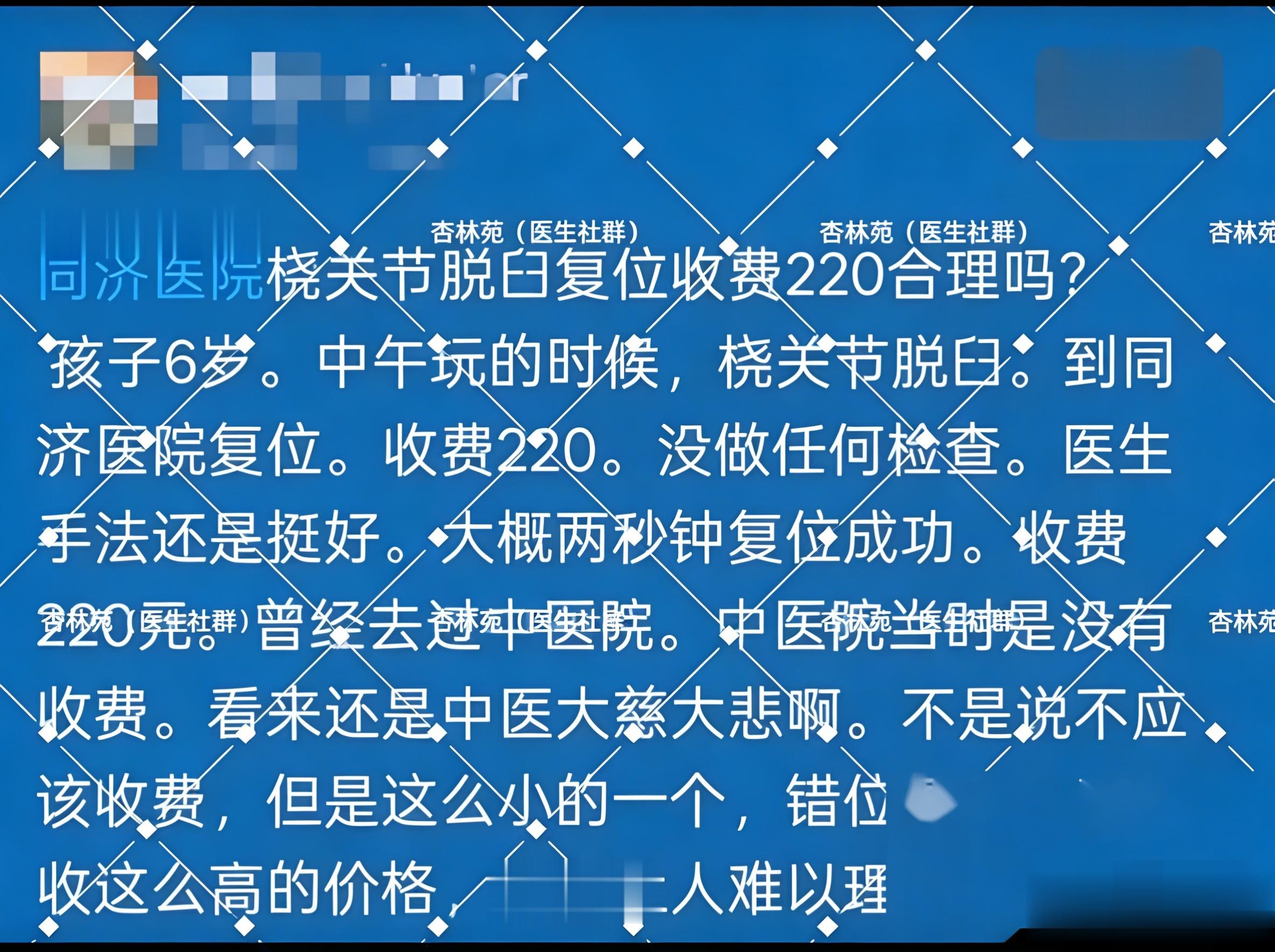 全国公立三甲医院的手法复位本来就在一两百块钱的正常定价区间。同济这收费合规合矩。