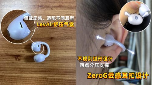 U型液态硅胶耳挂贴皮肤,不闷汗,单只7.3克,戴得很稳,跑步、跳绳等剧烈运动也不会掉。但耳挂对耳朵形状有要求,耳朵小或轮廓浅的人,可能觉得贴得不够紧,偶尔会轻微滑动。
